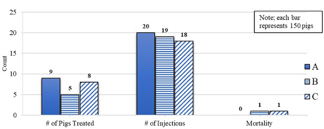 Over the 40-day experiment, there were no differences in average daily gain or average daily feed intake among pigs assigned to the three waters (Figure 1). This result is noteworthy because waters A and B were selected to represent “poor” quality, and water C to represent “good” quality. We theorized that waters A and/or B would depress pig growth performance and/or health compared with pigs consuming water C.